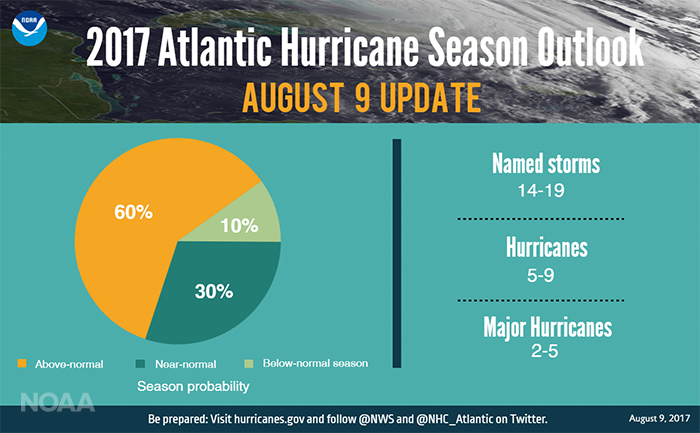 In an announcement made on Wednesday, NOAA updated the projected outlook, stating that there is a 60 percent chance of an above normal season with 14 to 19 "named" storms - and 2 to 5 major hurricanes.