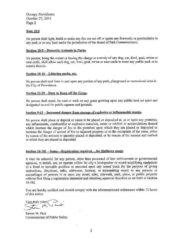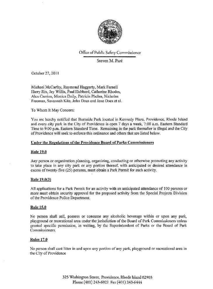 Noting that Burnside Park is only supposed to be open from 7:00am to 9pm, Public Safety commissioner Steven Pare today informed Occupy Providence protesters that they have 72 hours to leave the park.
