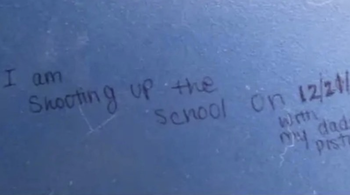 "On December 13, 2021, dozens of students texted their parents to inform them of a school shooting threat. A student had written in a girls' bathroom stall: "I am shooting up the school on 12/21/21 with my dads [sic] pistol."