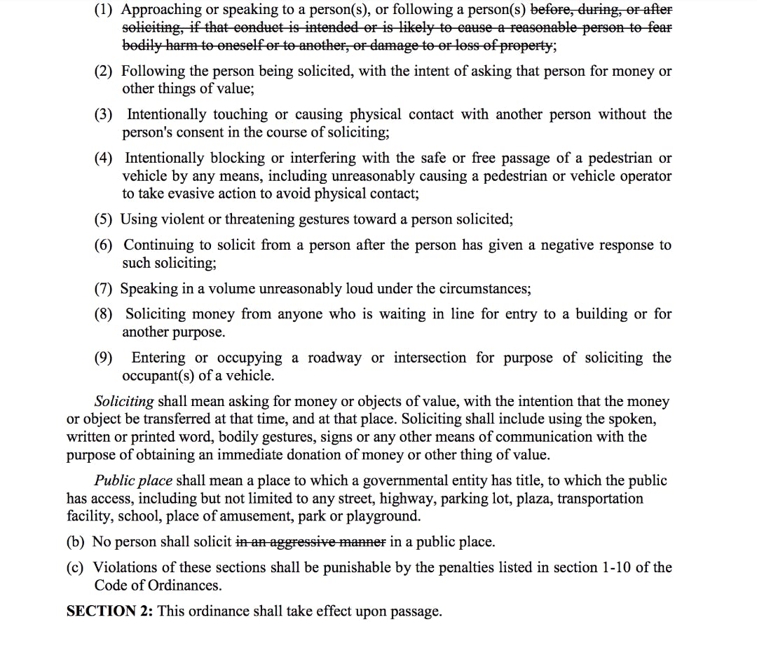The current ordinance as written says “no person shall solicit in an aggressive manner in a public place” — the proposed change would be to “no person shall solicit in a public place.”