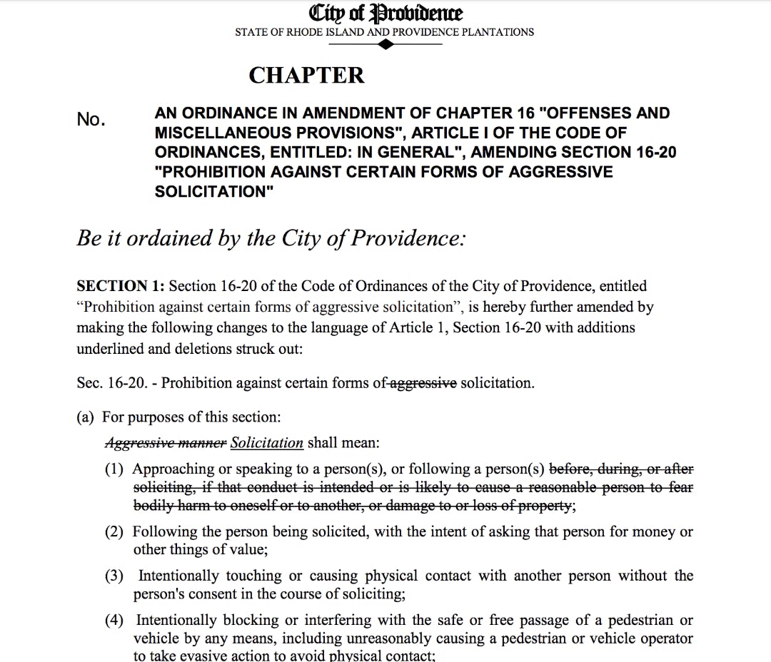 Narducci’s proposal to amend the city’s existing solicitation ordinance is coming before the Providence City Council Thursday night — and would prohibit against not just “aggressive” solicitation — but solicitation in general.