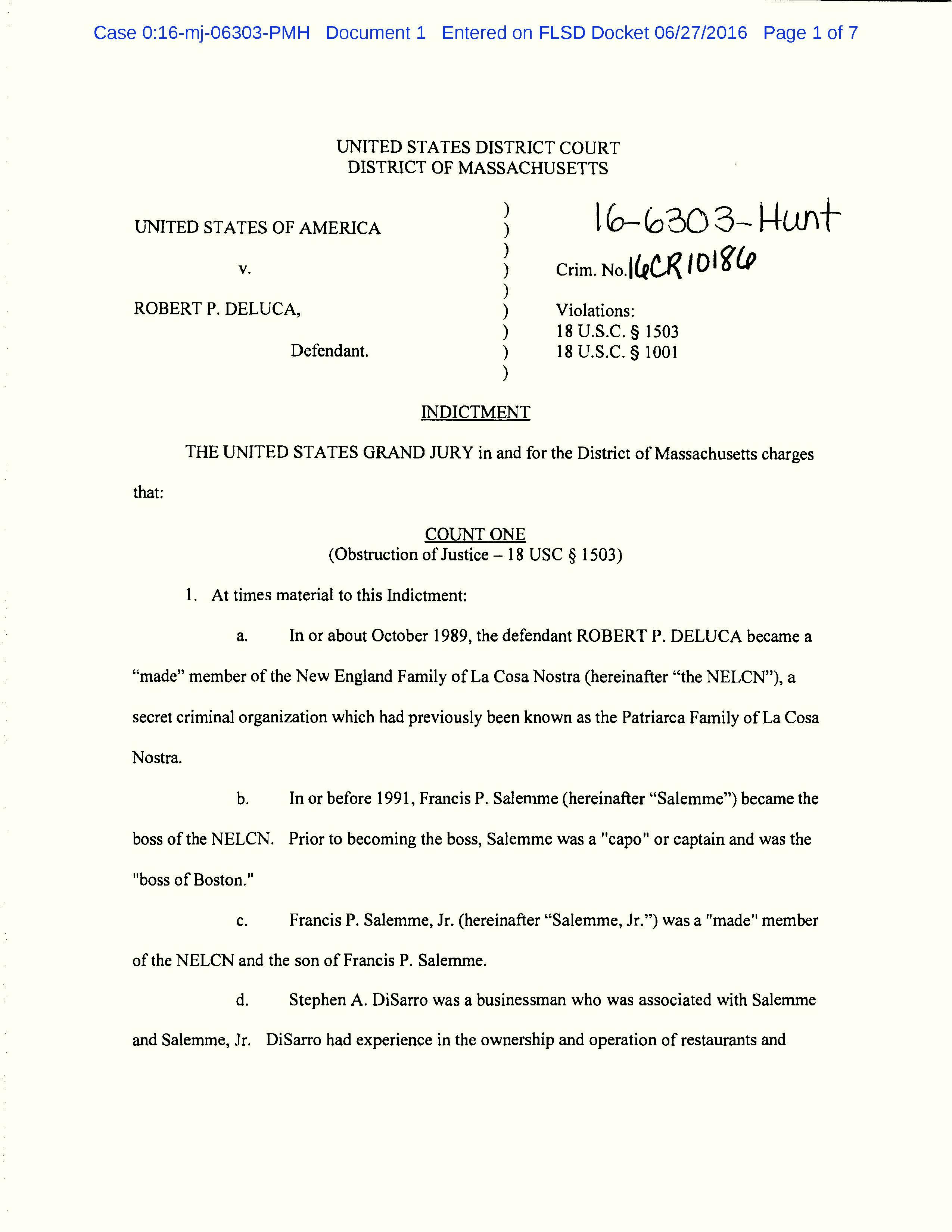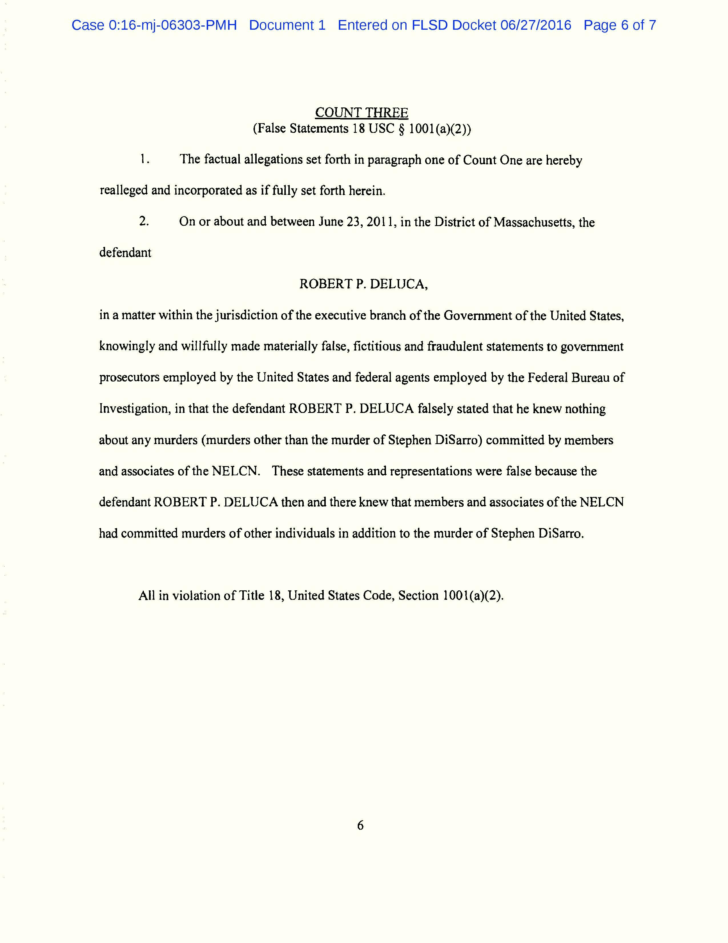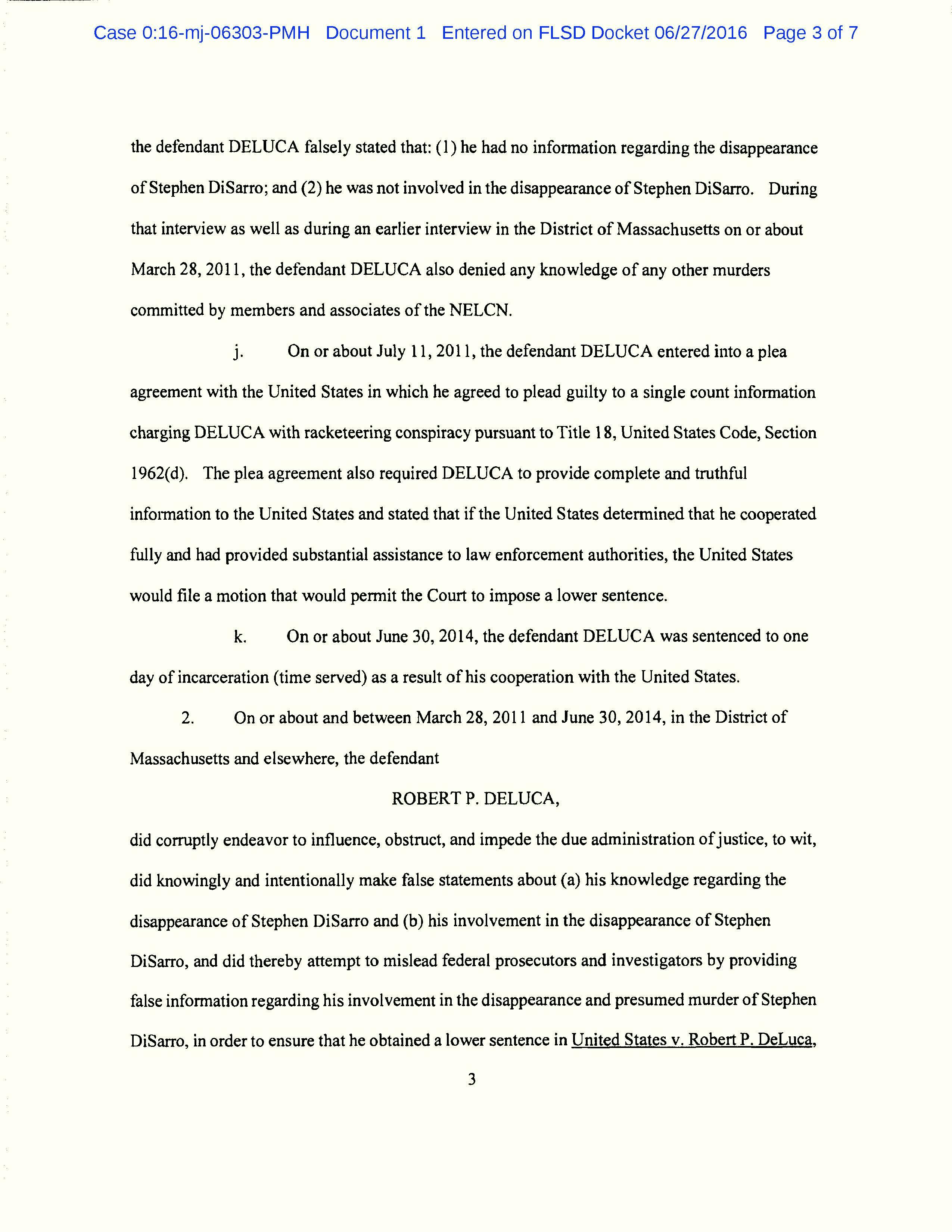 DeLuca was charged with one count of obstruction of justice and two counts of making false statements in connection with the disappearance and death of club owner Stephen DiSarro.