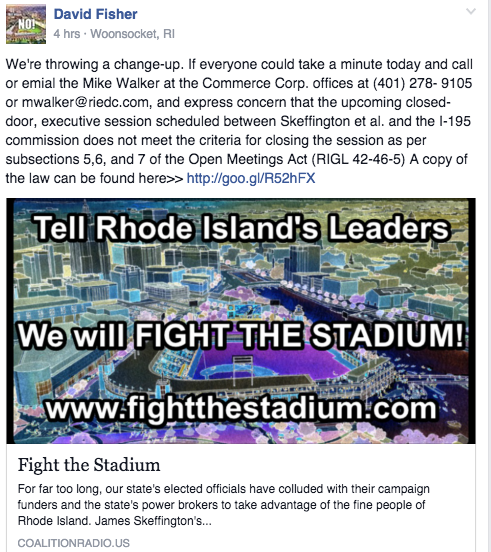 "We're happy to see that the I-195 Commission has decided to have this meeting in a transparent fashion. Many opponents called public officials, Including the Commission today, to request just that," said Dave Fisher, co-host of The Coalition radio. "We're encouraged that the voice of the public is being heard on this issue."