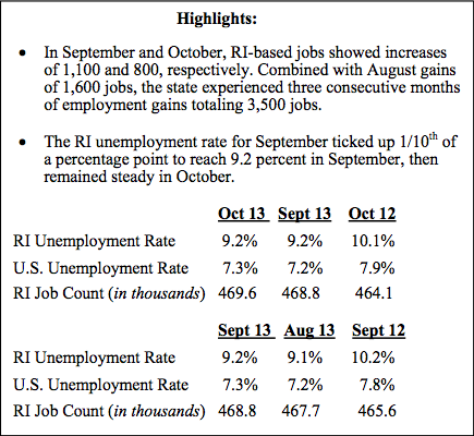 GET THE LATEST BREAKING NEWS HERE -- SIGN UP FOR GOLOCAL FREE DAILY EBLASTThe number of employed Rhode Island residents dropped 1,900 over the two month period, decreasing to 500,300 in October. From October 2012 to October 2013, the number of employed residents dropped by 5,400.