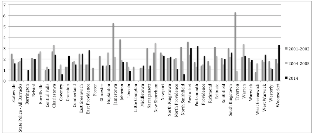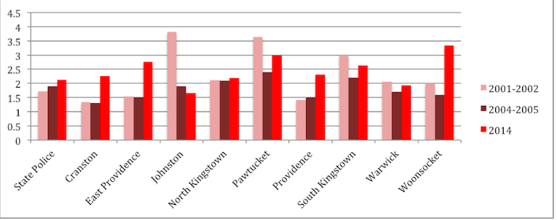 And, of the ten Rhode Island police departments that have seen an increase in racial disparity during searches since 2001-2002 include: Cranston, East Providence, North Kingstown, Providence, Woonsocket and the State Police. while Pawtucket and South Kingstown have seen an increase in this disparity since 2004-2005.