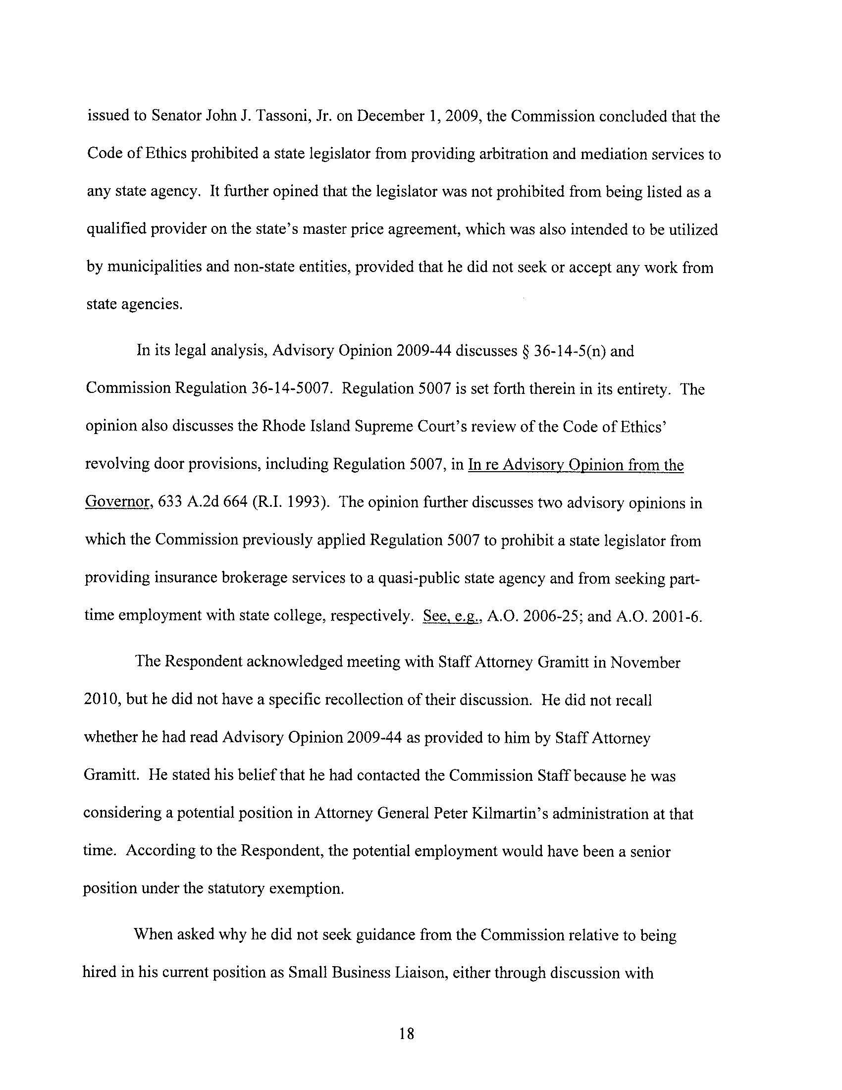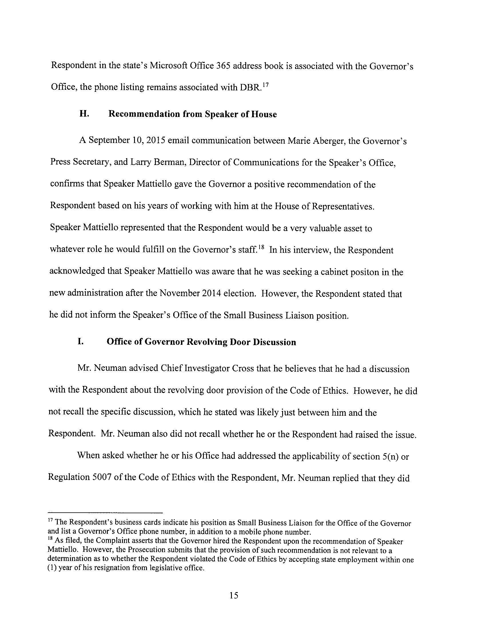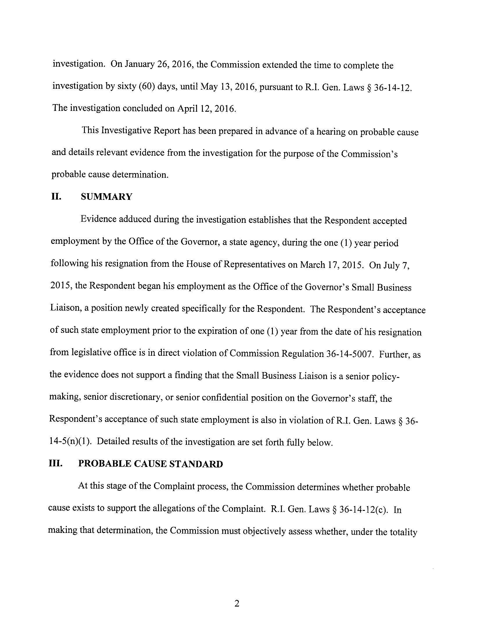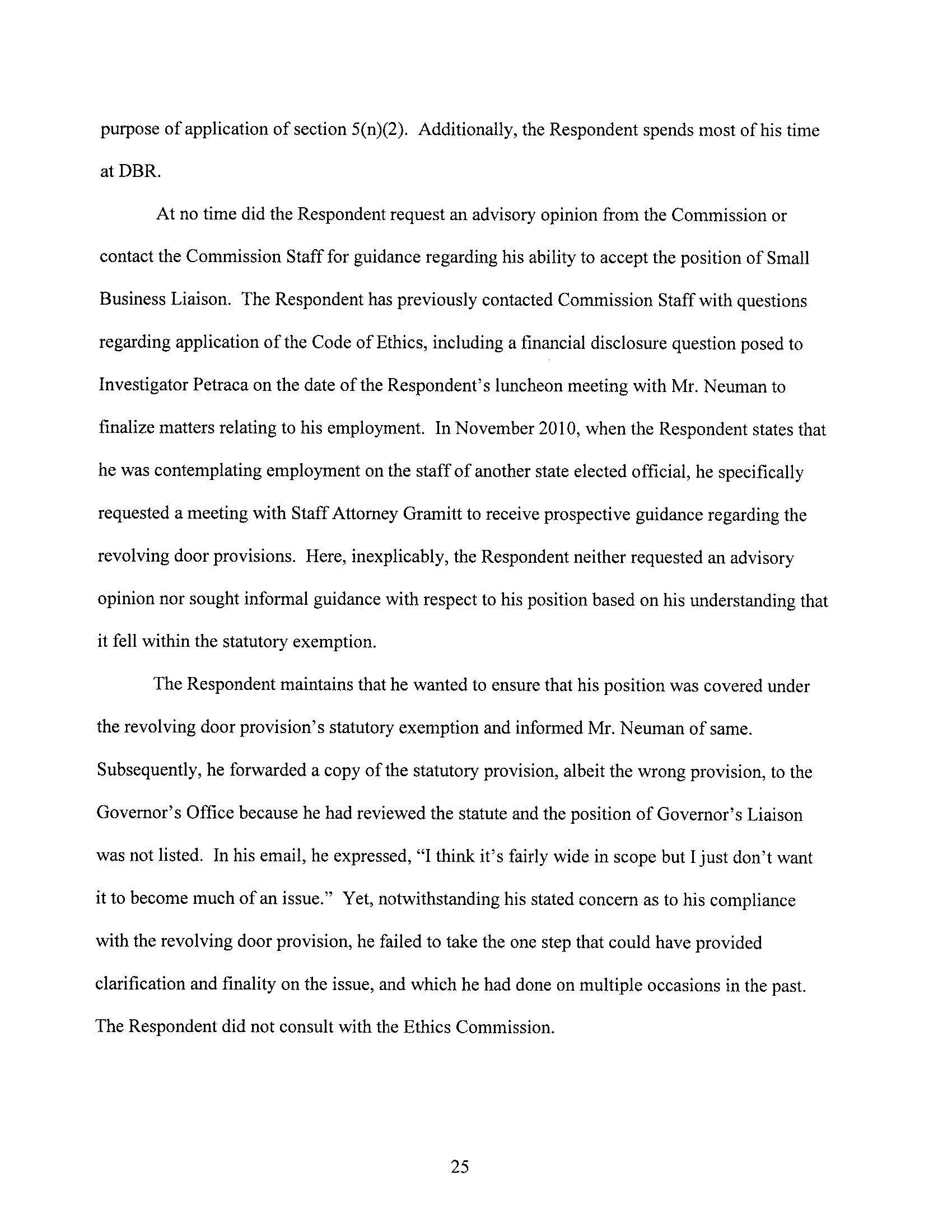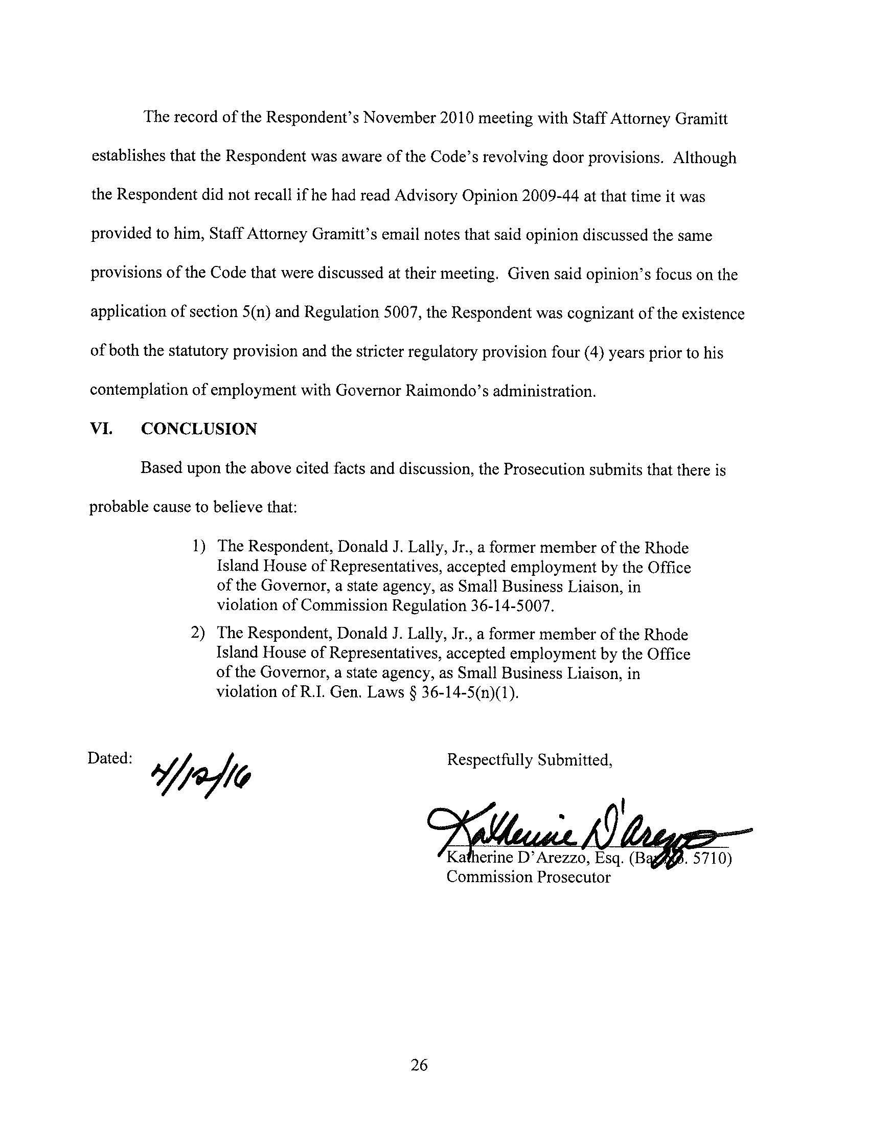 The Ethics Commission found probable cause that Mr. Lally violated the revolving door provisions of the Code of Ethics. Note that this is only a preliminary step in the case, and is not a finding of violation.