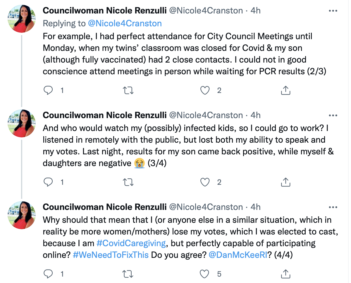 “We need to relax Open Meeting Law in RI again, allowing elected officials’ remote attendance @ meetings (w/ a valid medical/caregiving excuse). This Covid uptick will disproportionately have negative effects on women & parents- even more so moms, esp single moms & POC #justsaying,” Renzulli Tweeted on Wednesday.