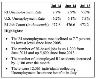 The unemployment rate in Rhode Island dropped to 7.7 percent in July, down from the June 2014 rate of 7.9% and the July 2013 rate of 9.6%, according to the RI Department of Labor and Training.