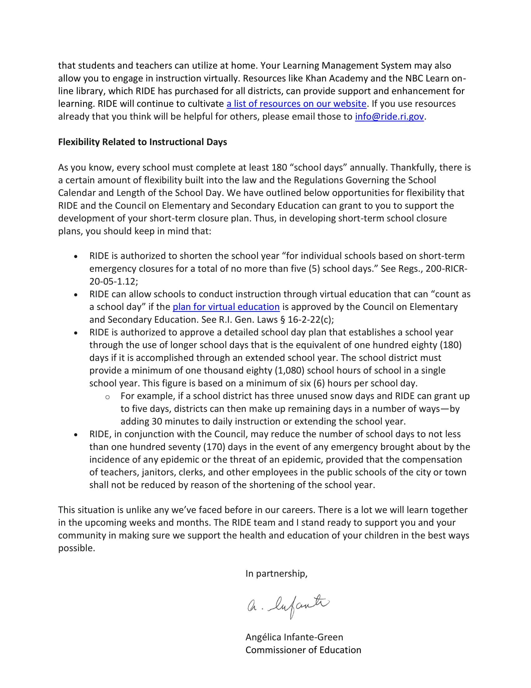 “This situation is unlike any we’ve faced before in our careers. There is a lot we will learn together in the upcoming weeks and months. The RIDE team and I stand ready to support you and your community in making sure we support the health and education of your children in the best ways possible,” concluded Infante-Green.