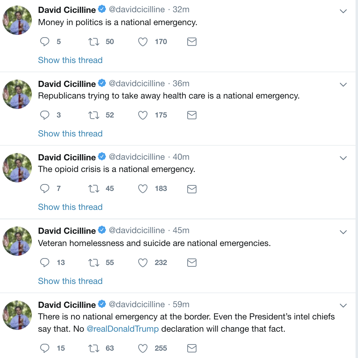 “There is no national emergency at the border. Even the President’s intel chiefs say that. No @realDonaldTrump declaration will change that fact,” Congressman David Cicilline Tweeted on Thursday.