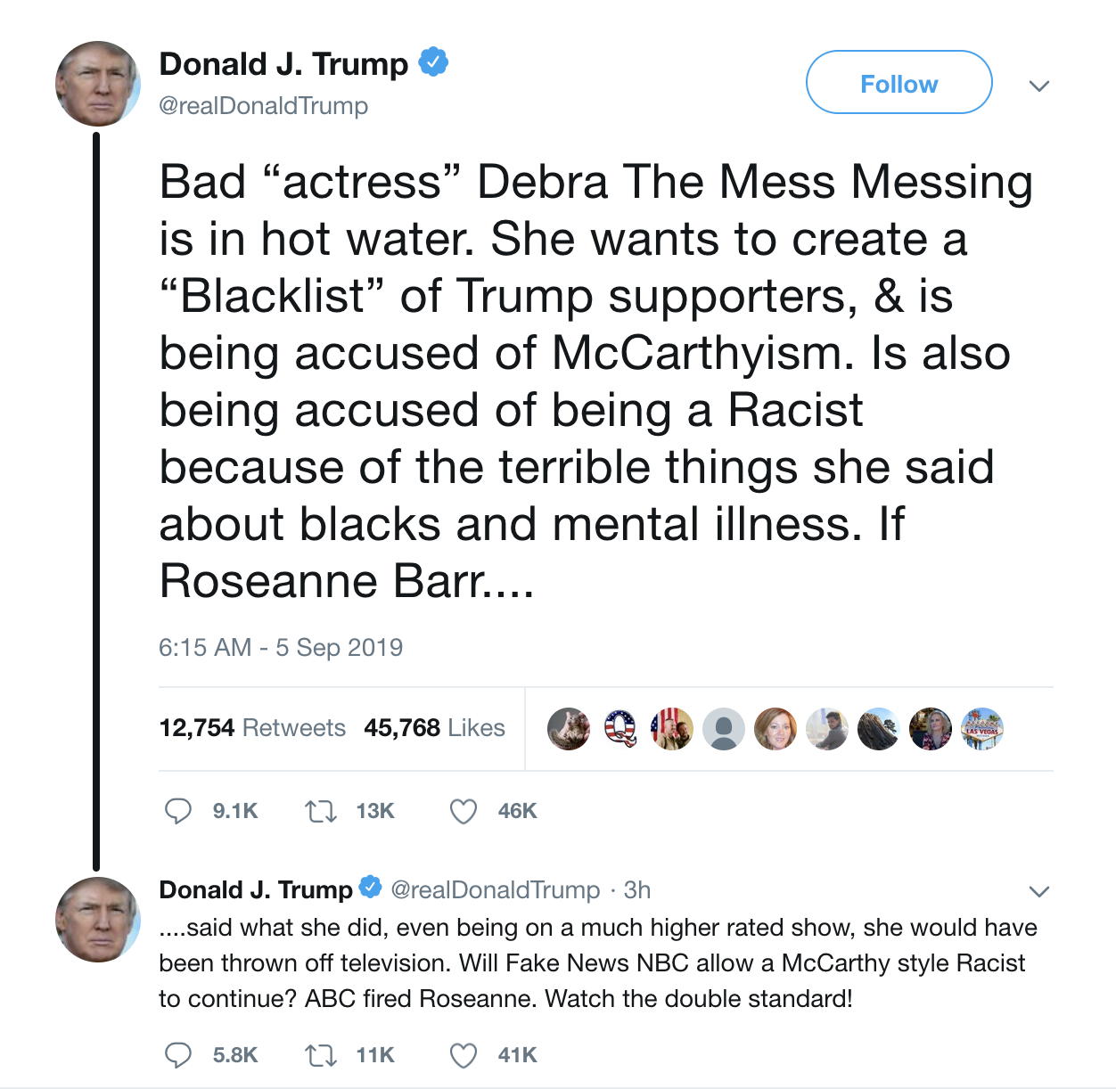 ....said what she did, even being on a much higher rated show, she would have been thrown off television. Will Fake News NBC allow a McCarthy style Racist to continue? ABC fired Roseanne. Watch the double standard!