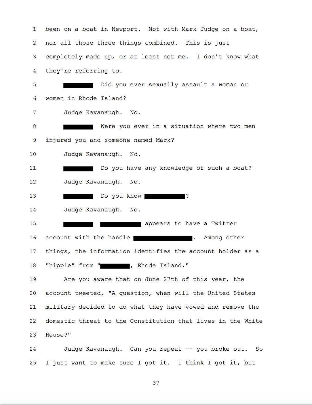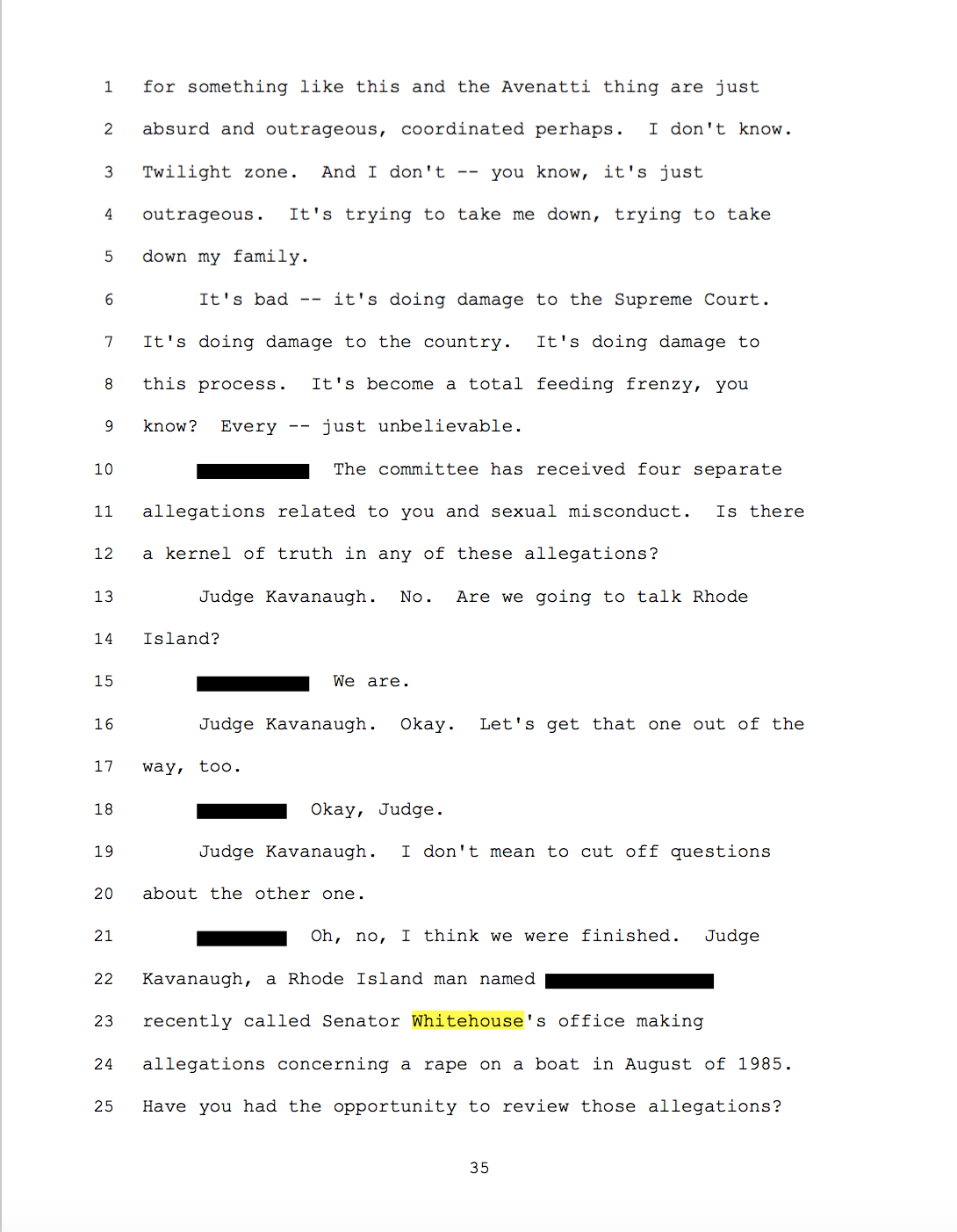 [Redacted staffer]: So, for the record, the report from Senator Whitehouse states, “Senator Whitehouse received a call this morning from a Rhode Island constituent, [redacted], who made allegations regarding U.S Supreme Court nominee Brett Kavanaugh. [Redacted] reported that early on a Sunday morning in August of 1985, a close acquaintance of the constituent was sexually assaulted by two heavily inebriated men she referred to at the time as Brett and Mar,