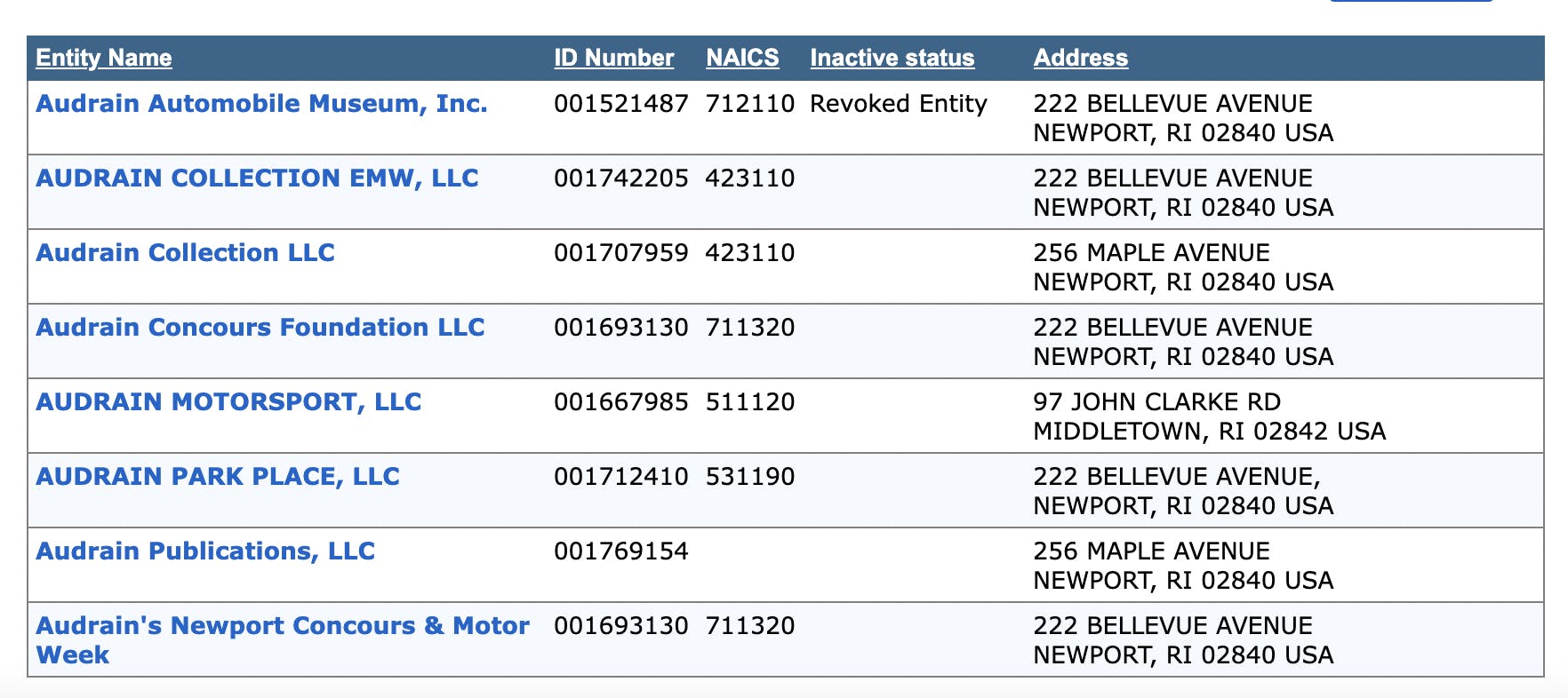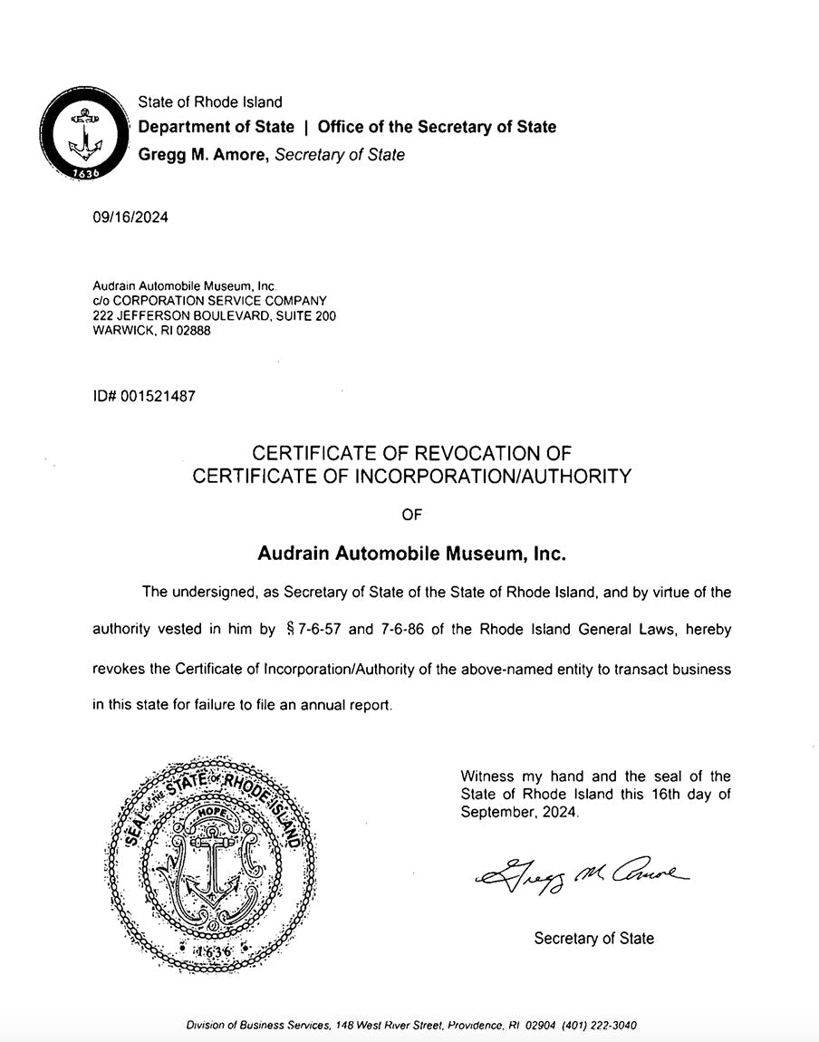According to the Rhode Island Secretary of State's database, Audrain Auto Museum’s business registration with the state of Rhode Island was revoked on September 9, 2024.