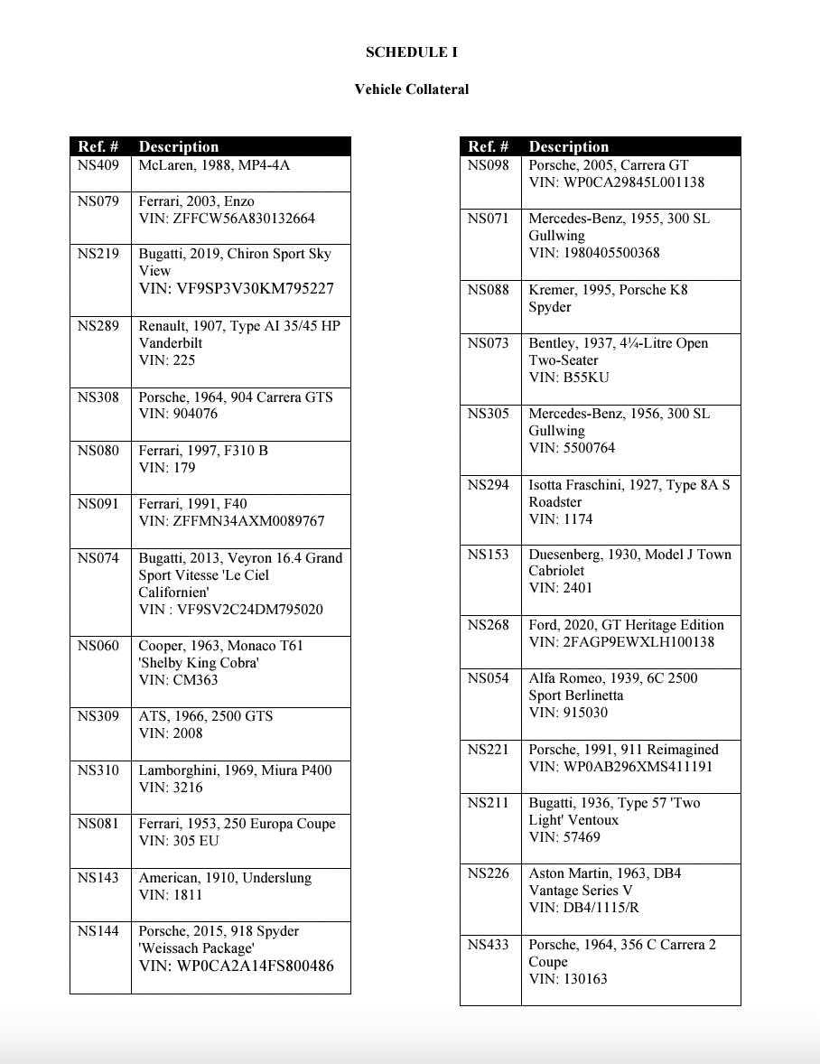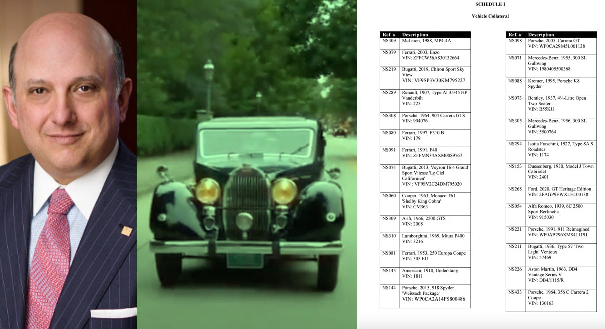 The collateralized autos include three Bugattis, four Ferraris, multiple Mercedes-Benzs, including two highly sought-after Gullwings, a 1907 Renault, and many more.