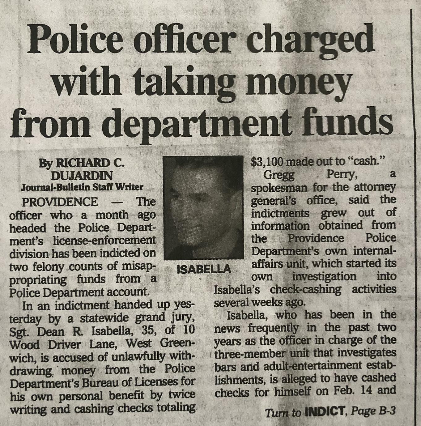 “Isabella, 35, of 10 Wood Driver Lane, West Greenwich, is accused of unlawfully withdrawing money from the Police Department's Bureau of Licenses for his own personal benefit by twice writing and cashing checks totaling $3,100 made out to ‘cash.’