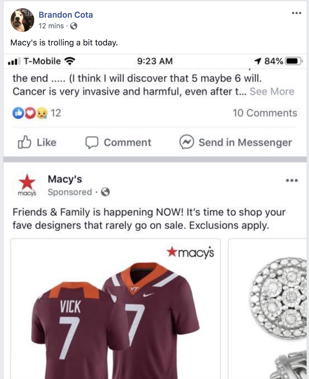 “Macy’s is trolling a bit today,” said Cota, who had just recently shared the Village Voice article, “Reminder: Michael Vick’s Dogs Were Shot, Electrocuted, Hanged, and Beaten to Death.”