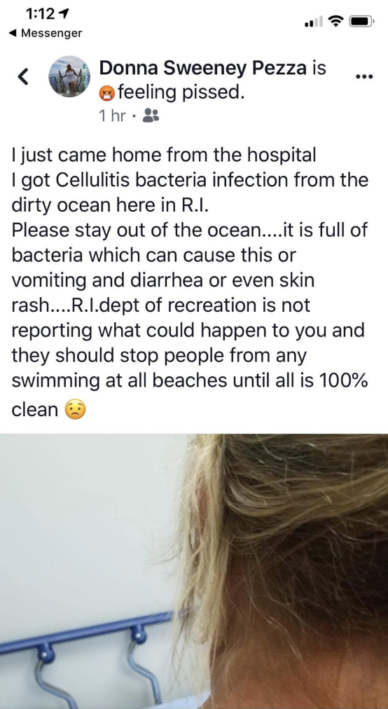 "I just came home from the hospital — I got Cellulitis bacteria infection from the dirty ocean here in R.I. Please stay out of the ocean…it is full of bacteria which can cause this or vomiting and diarrhea or even skin rash…R.I. Department of Recreation is not reporting what could happen to you and they should stop people from any swimming at all beaches until all is 100% clean."