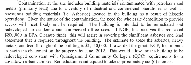 It wasn’t until late October, right before the actual purchase date, that the first phase of an environmental site assessment uncovered what would be expected after a century of industrial and commercial use: asbestos throughout the upper floor tiles of the building, lead paint, and other hazardous metals.