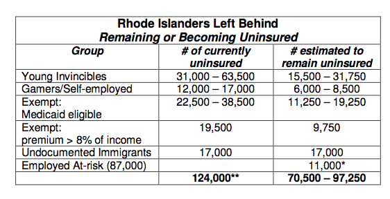 Today, Parnell, President of Impact Policy Management, a public policy consulting in Washington, D.C., and adjunct scholar with the Center for Freedom and Prosperity, makes the case that the number of Rhode Island residents expected to remain uninsured after implementation of the ACA could range from "over half to up to three-quarters of the current uninsured population of 124,000; or approximately 70,000 – 97,000 people in the state."