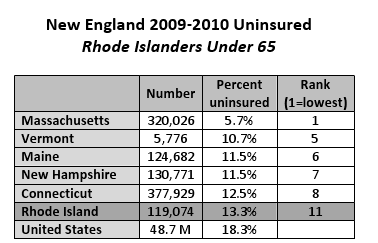 One in eight non-elderly people living in Rhode Island (119,000) had no health coverage in 2009-2010, an increase of 8,000 from the prior year, according to Census Bureau figures released yesterday. Nationally, 48.7 million people under 65 (18.3 percent) had no health insurance last year.