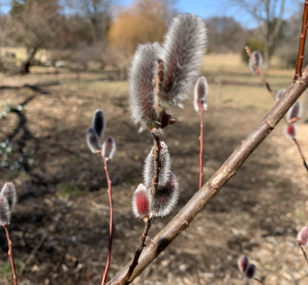 We also strolled past plots of native pussy willows, which were the classic silver or gray, as well as other types of the shrub, which weren’t labeled. These plants included one pussy willow that displayed fluffy silver flower spikes with neon green highlights.