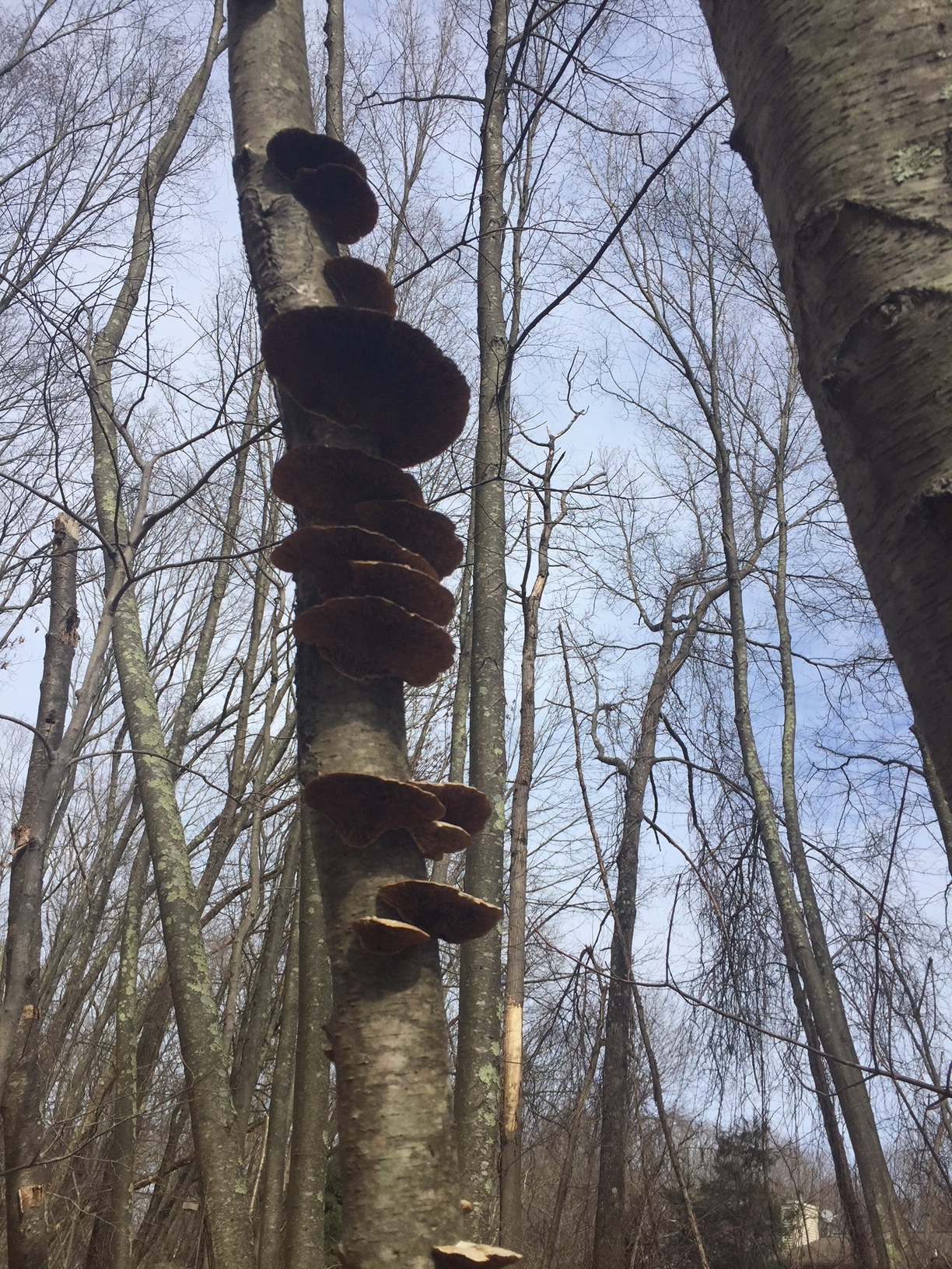 A long stonewall ran through the forest, which featured multiple tall red oaks. Wind whooshed through their crowns. We also found many black birch trees, including some lofty specimens, particularly where the trail rose into the rocky ledges. Black birch bark contains methyl salicylate, a liquid that smells like wintergreen.