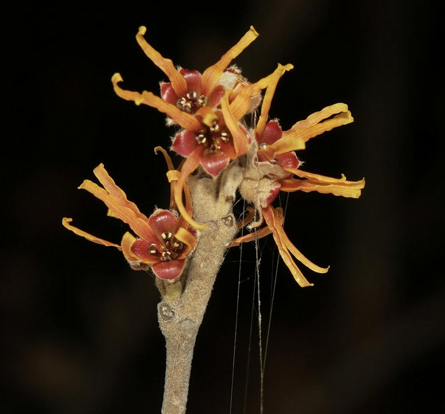 Witch hazel is a shrub or small tree. At least two species are native to North America. Both of them flower in autumn. It’s the Asiatic cultivars or their hybrids that bloom in mid-winter. And because it’s like a refrigerator outside, the flowers will last for weeks to come.