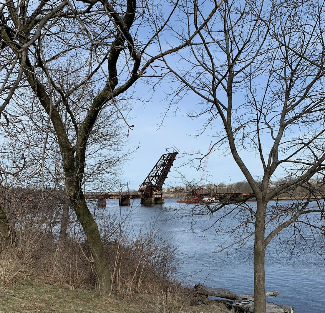 The trail, if you’re wondering, runs along the Seekonk River, including views of the abandoned, and stuck-open-for-more-than 40-years drawbridge, officially known as the Crook Point Bascule Bridge.
