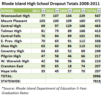 In the last four years alone, just over 7,800 students have dropped out of school in Rhode Island. Of that number, over 50 percent (3,996) come from just 12 high schools, according to a GoLocalProv analysis of 5-year cohort dropout rates between the class of 2008 and the class of 2011. Depending on the year Rhode Island had between 58 and 62 public high schools.