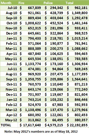 Between July 2010 (the beginning of the 2011 fiscal year) and May 18, 2012 (when the city released its numbers to GoLocalProv), Providence firefighters received $17,617,640 in overtime pay and police officers received $4,575,215.