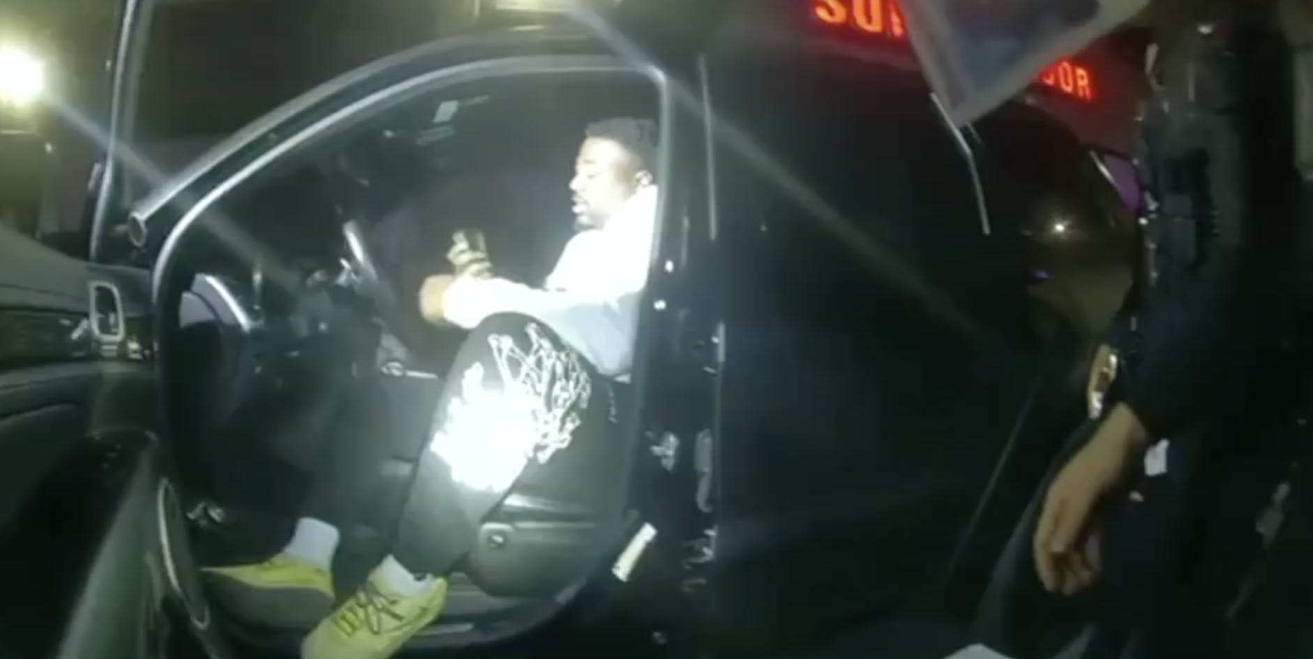 Barmore can be seen asking police if they would like to enter a fight, calling officers the “N-word” and threatening to sue them.