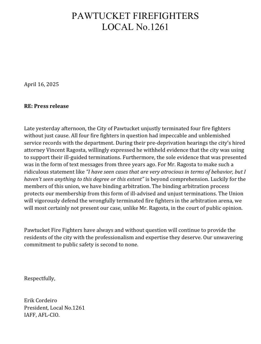 GET THE LATEST BREAKING NEWS HERE -- SIGN UP FOR GOLOCAL FREE DAILY EBLASTErik Cordeiro, President of the union which is an affiliate of IAFF and the AFL-CIO, said, "The Union will vigorously defend the wrongfully terminated firefighters in the arbitration arena, we will most certainly present our case, unlike Mr. Ragosta, in the court of public opinion.”