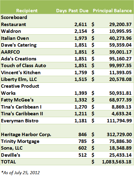 Of the 18 severely delinquent loans that weren’t written off in June, recipients owe the city between $4,633.24 (Tina's Caribbean II) and $312,729 (Heritage Harbor). Records show 14 of the loans are at least 1,100 days behind on payment and two are more than 2,100 days late.