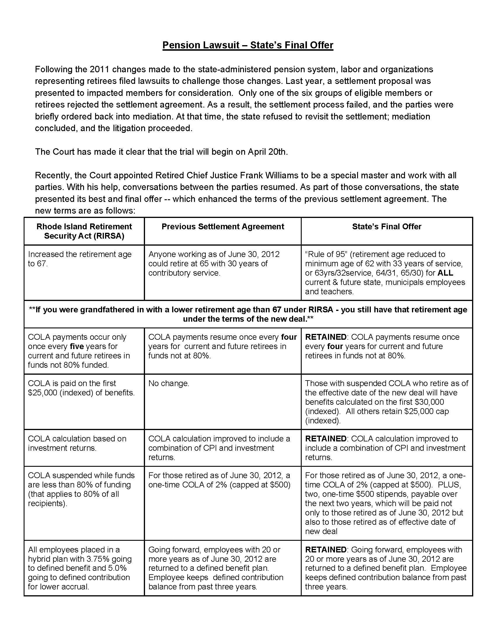 If the vote to accept the deal passes, Judge Sarah Taft-Carter has final approval and the legislature would be directed to pass it into law. If the vote does not pass, then the trial would proceed on April 20 and pensioners would remain under the changes passed in 2012, not the proposed settlement from last year.