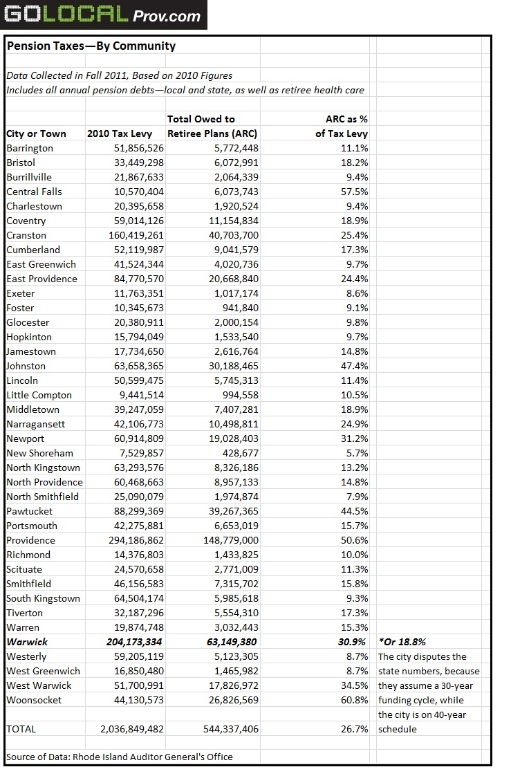 Out of $2 billion levied in local property taxes across Rhode Island in 2010, a total of $544 million, or 26.7 percent, was needed to keep local retirement plans afloat, according to 2010 data collected by the Rhode Island Auditor General. (The figures include what communities owe to the state MERS and ERS plans as well as their own locally administered plans. The numbers encompass pensions and retiree health care costs, known as Other Post Employment Benefits, or OPEB.)