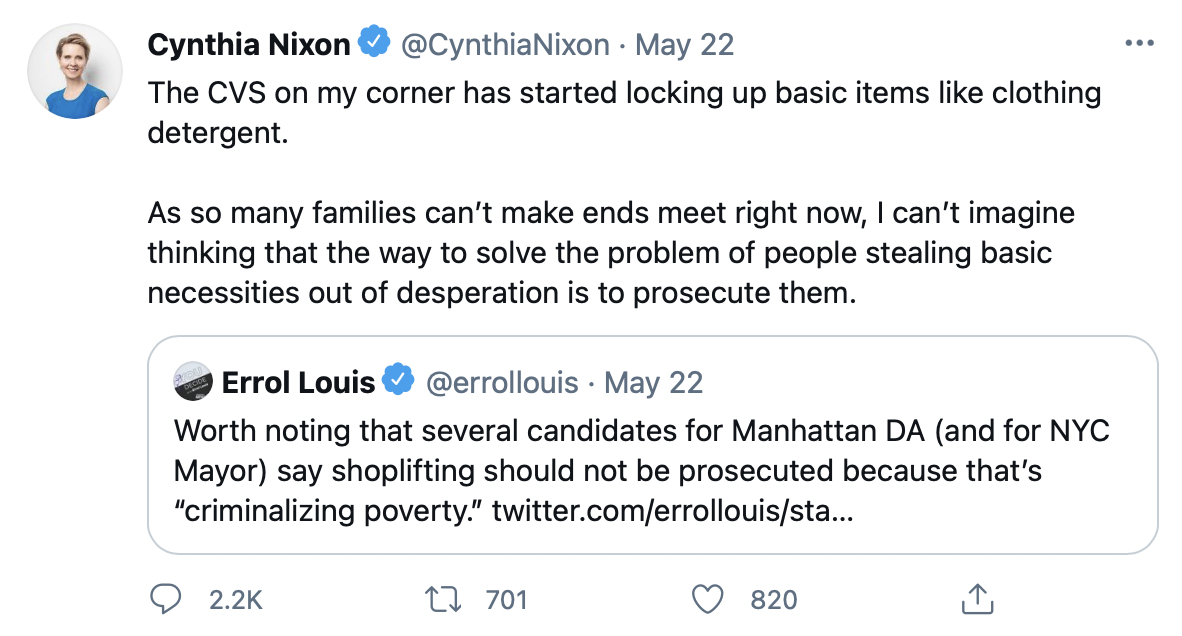 “Worth noting that several candidates for Manhattan DA (and for NYC Mayor) say shoplifting should not be prosecuted because that’s ‘criminalizing poverty,’” Tweeted Errol Louis, the host of Inside City Hall, in response.
