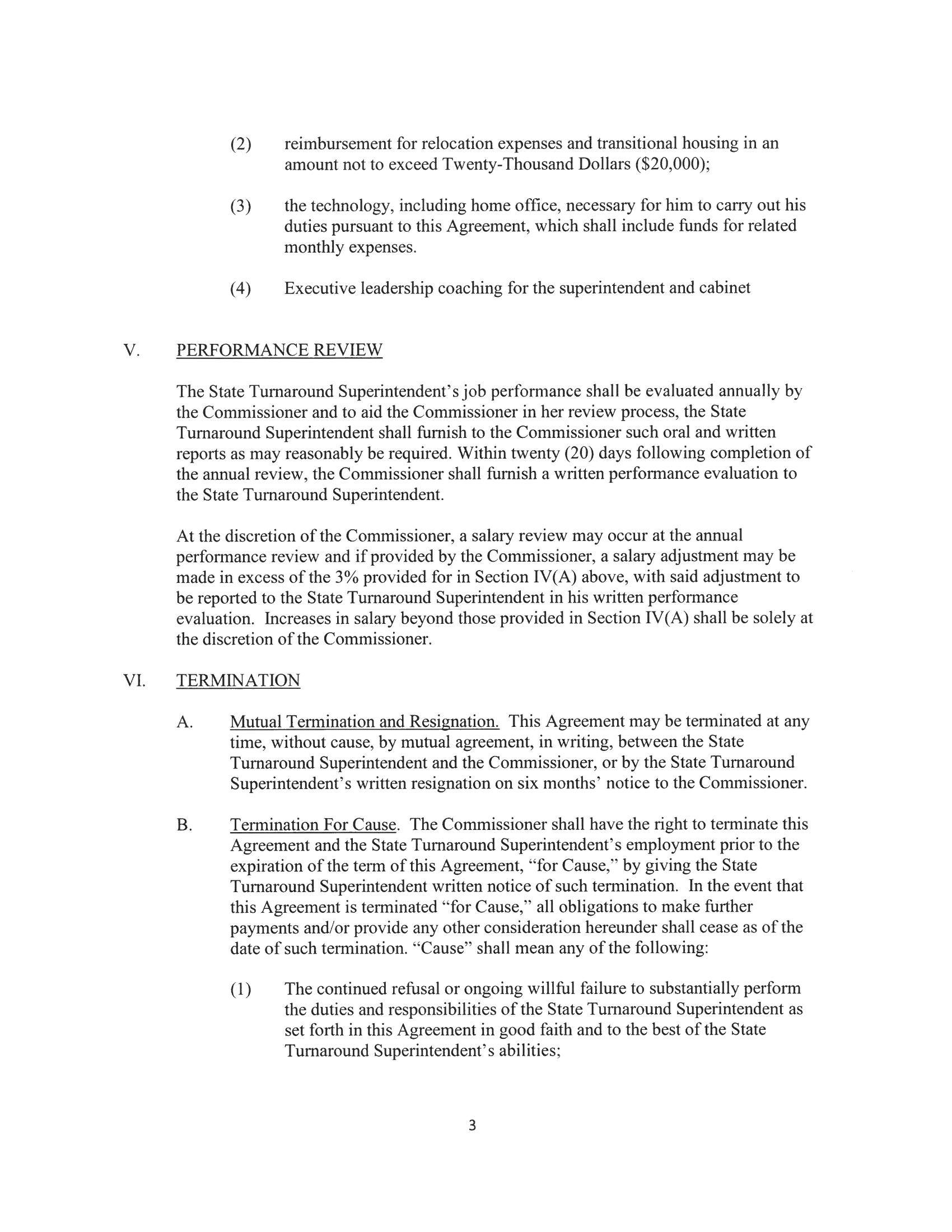 Termination for Cause: The Commissioner shall have the right to terminate this Agreement for the State Turnaround Superintendent’s employment prior to the expiration of the term of the Agreement, “for Cause,” by giving the State Turnaround Superintendent written notice of such termination. In the event that this Agreement is terminated “for Cause,” all obligations to make further payments and/or provide any other consideration hereunder shall cease as of the date of such termination. “Cause” shall mean any of the following: