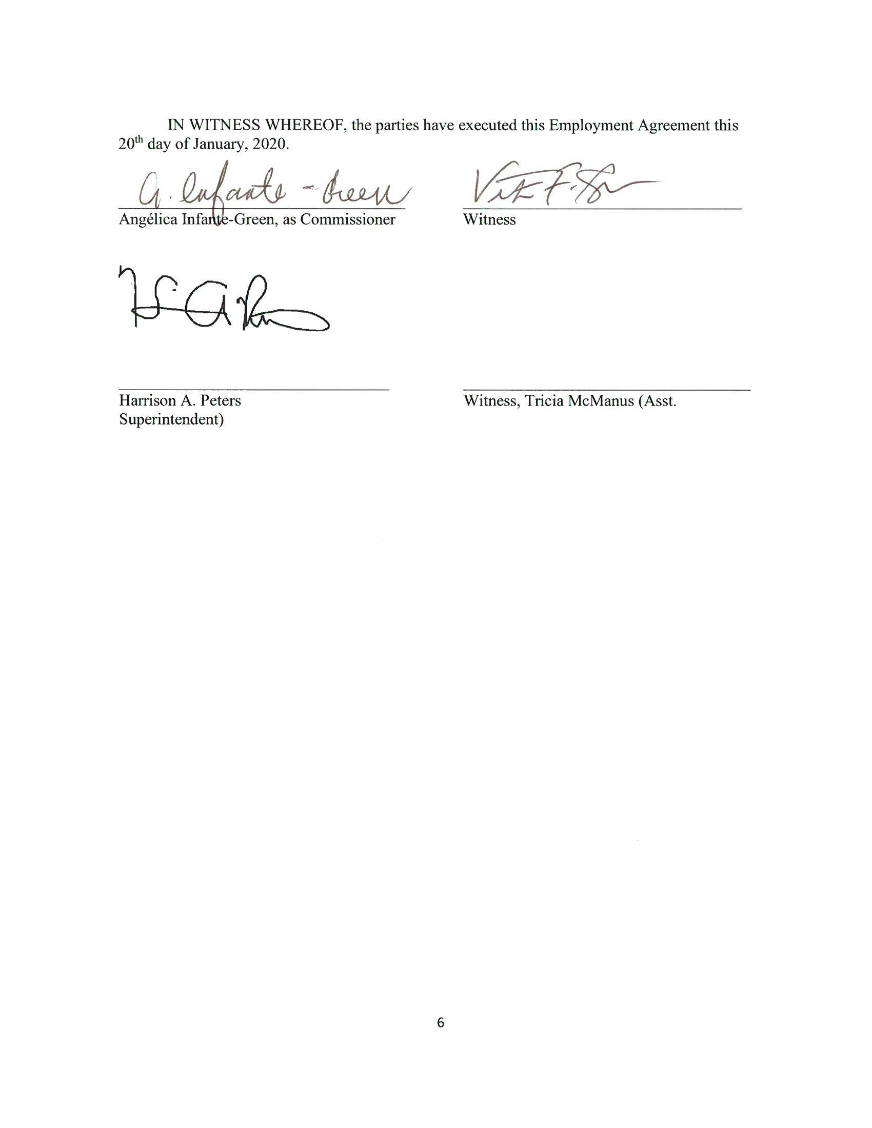 The contract allows for Infante-Green to fire Peters without cause. The contract specifies that she provide Peters with 60 day written notice, but in that case, the state is obligated to pay one year of salary and benefits. So between the 60-day notice period and the additional year between salary, the total payment will cost the state approximately $300,000.