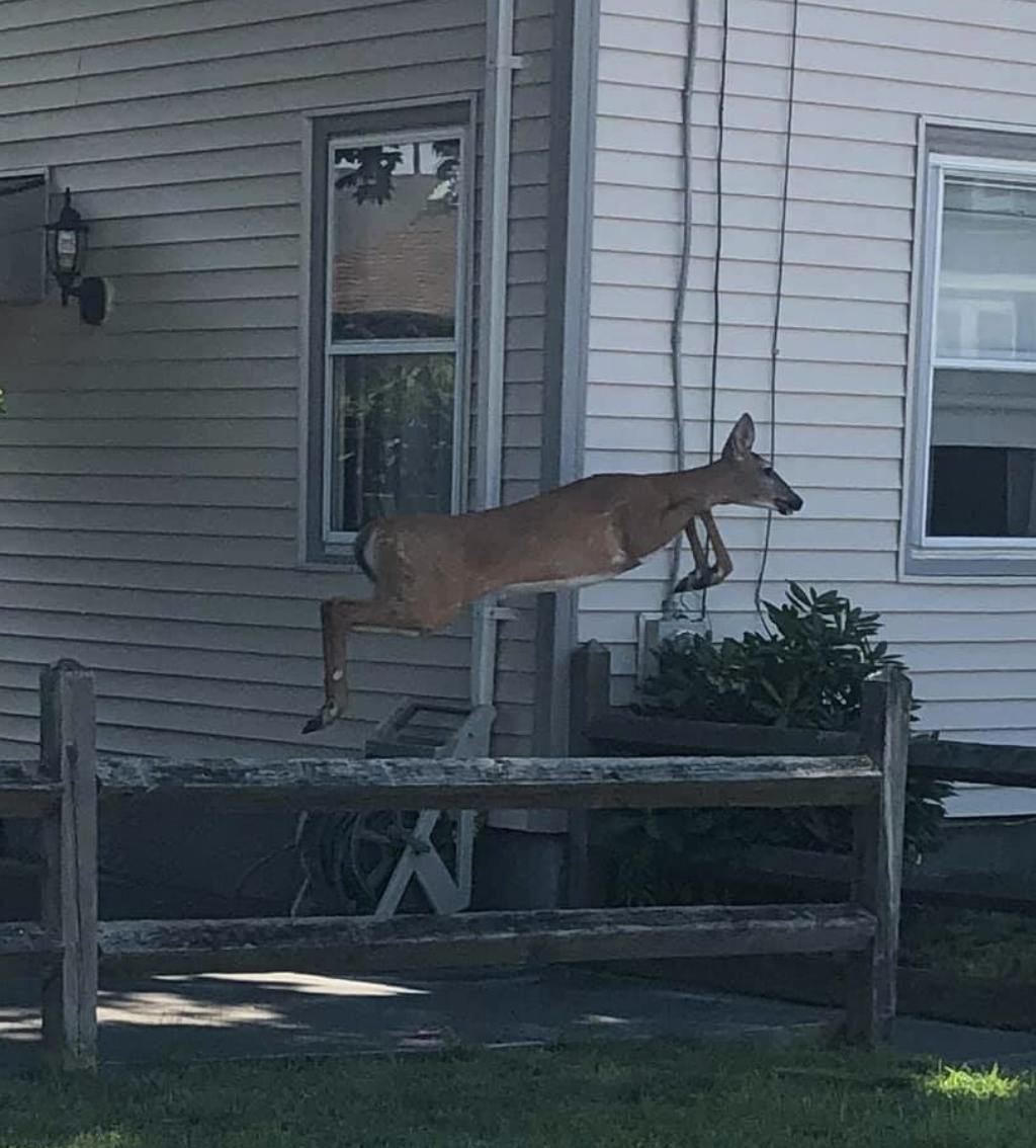 Scott Greco snapped the amazing picture of a deer jumping through a yard in Cranston on Tuesday.