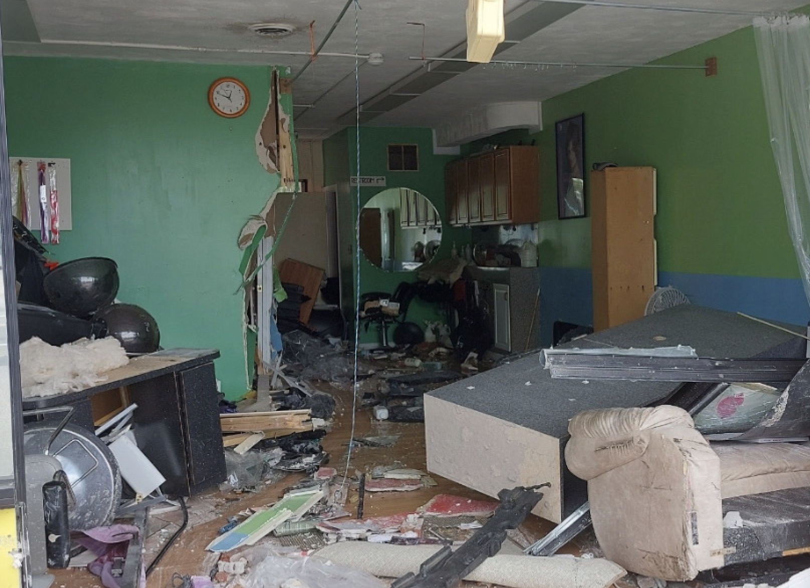 The car continued across the street and drove through the front entrance on the hair salon and stopped in the middle of the salon.