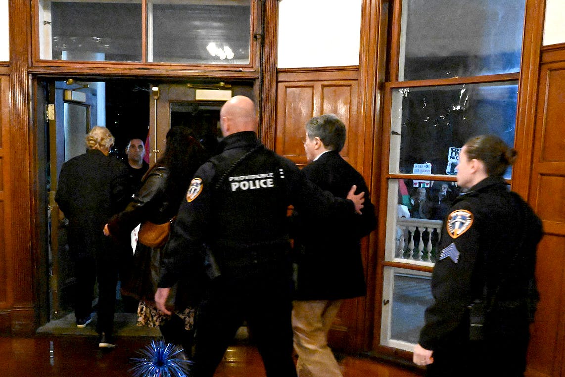 Protestors disrupted the Democratic Unity rally held at the Roger Williams Park Casino on Monday night.