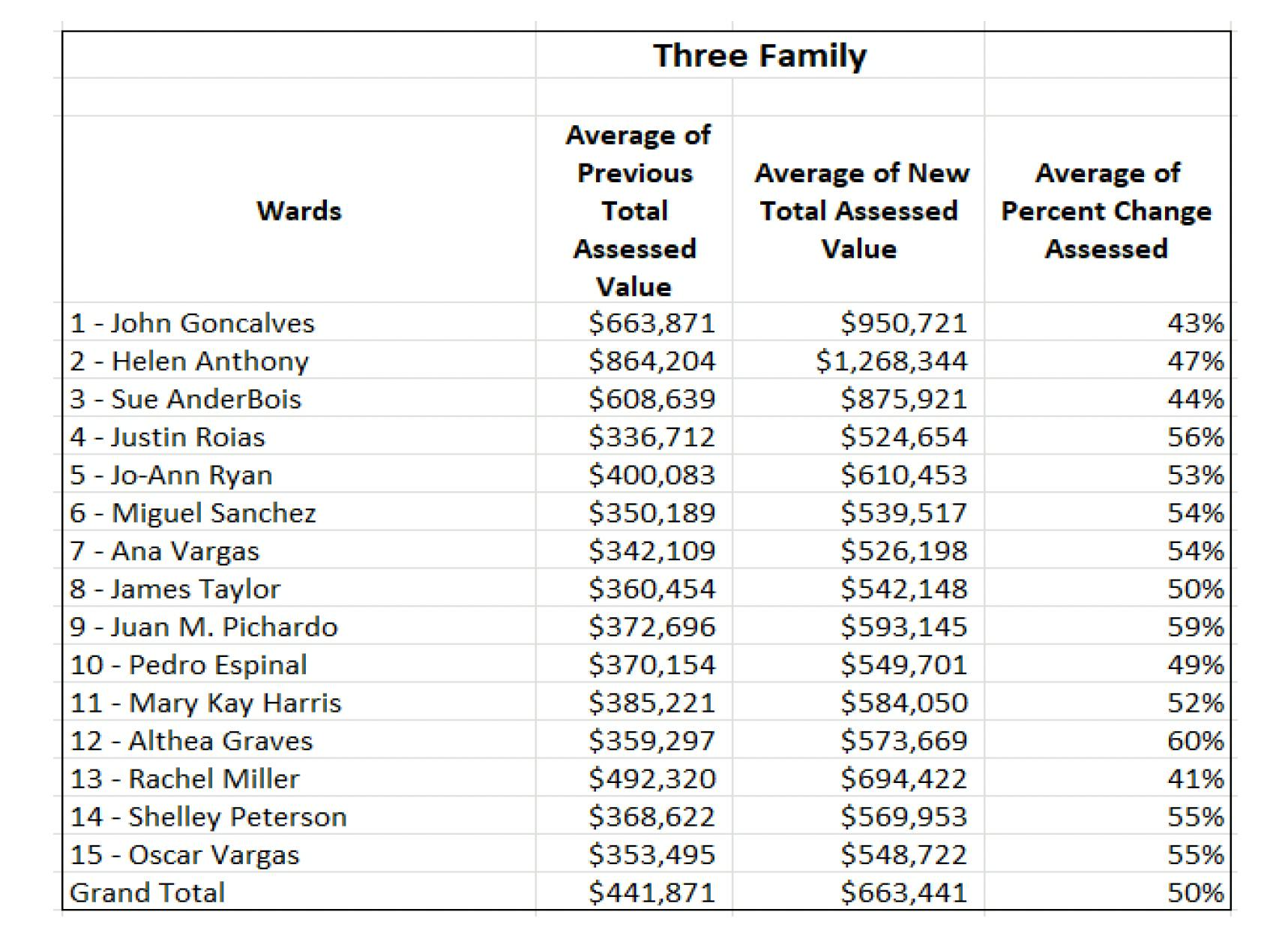 The assessed value of three-family homes is the highest in Ward 2, at $1,268,344. The ward that saw the highest percentage increase was Ward 12, which saw a 60% increase.