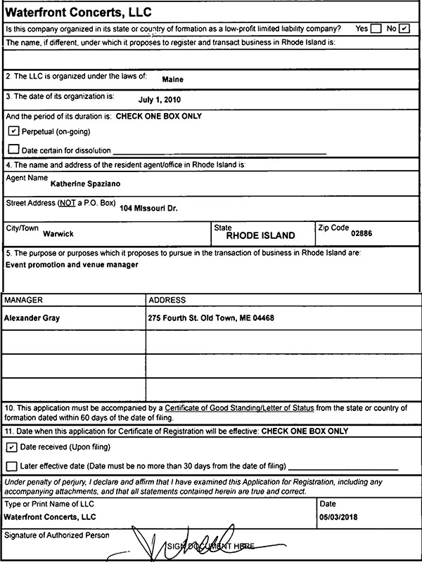 His corporation in Rhode Island, Waterfront Concerts, LLC’ s agent is Katherine Spaziano, according to documents filed with the RI Secretary of State’s Office.