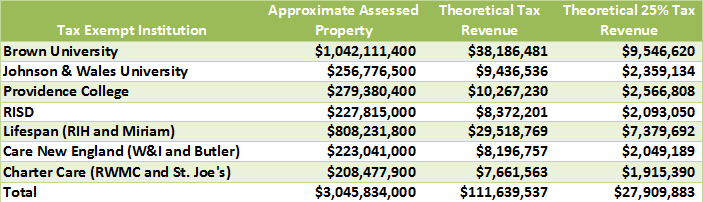 The property value of large tax-exempt institutions in the city is approximately $3 billion, which would generate $105 million in revenue if fully taxed. Brown University and Lifespan, which oversees Rhode Hospital and the Miriam Hospital, combine to own over $1.8 billion in tax-exempt property.