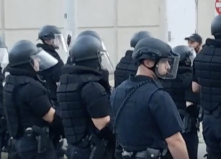 At Providence’s Public Safety Complex, protestors clashed with police dressed in riot gear, and five protestors were arrested. Then, after 9 PM a group of approximately 150 to 200 marched down Elmwood Avenue to the park at the