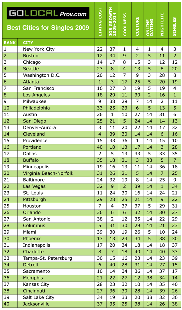 How'd Providence fare in the metric web created by Forbes? First of all, let's examine the methodology. They ranked 40 of the largest continental U.S. metropolitan statistical areas in seven different categories: coolness, cost of living alone, culture, job growth, online dating participation, nightlife and the ratio of singles to the entire population of the metro. Each metro was assigned a ranking of 1 to 40 in each category, based on quantitative data, and all categories were weighted equally. Fair enough. I guess. This doesn't take safety, access to STD counseling, or ratio of ER visits to cocktail lounges into consideration, but there's always room for improvement in science, right?