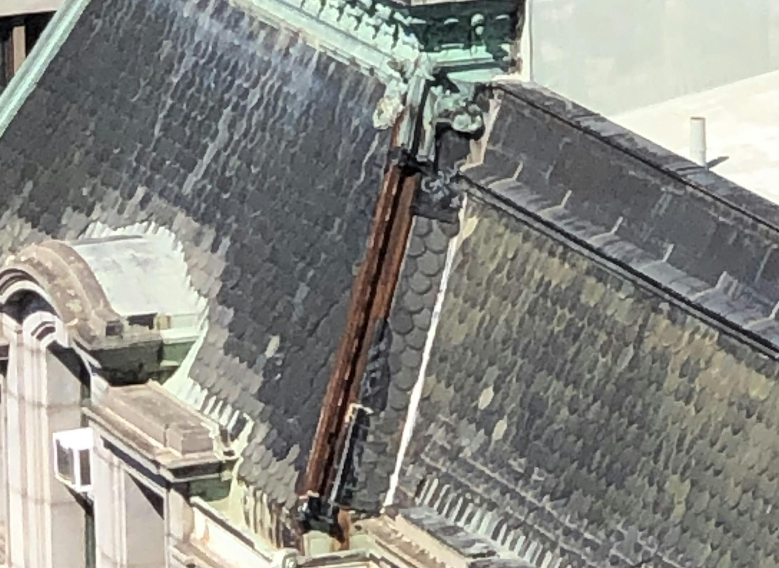 Pieces of City Hall are literally falling off. GoLocal went to the top of an adjoining building to photograph the roof of the historic Second Empire edifice, and found that large pieces of the copper roof missing and the underlying steel support badly rusted.