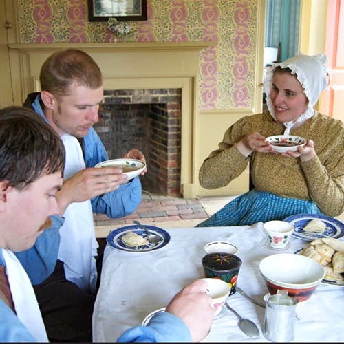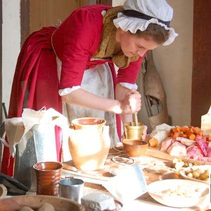 Step back into the year 1627 for an evening of entertainment and hospitality with the residents of the English Village. Sit down to a “groaning board” filled with the finest food that this season of plenty has to offer. Discover the table manners that traveled across the Atlantic with the “Pilgrims,” (remember not to wipe your mouth with the tablecloth!) and find out about what really happened at the harvest celebration of 1621. During dinner, you will be entertained with psalms and songs and perhaps you will be convinced to join in singing a round or two.