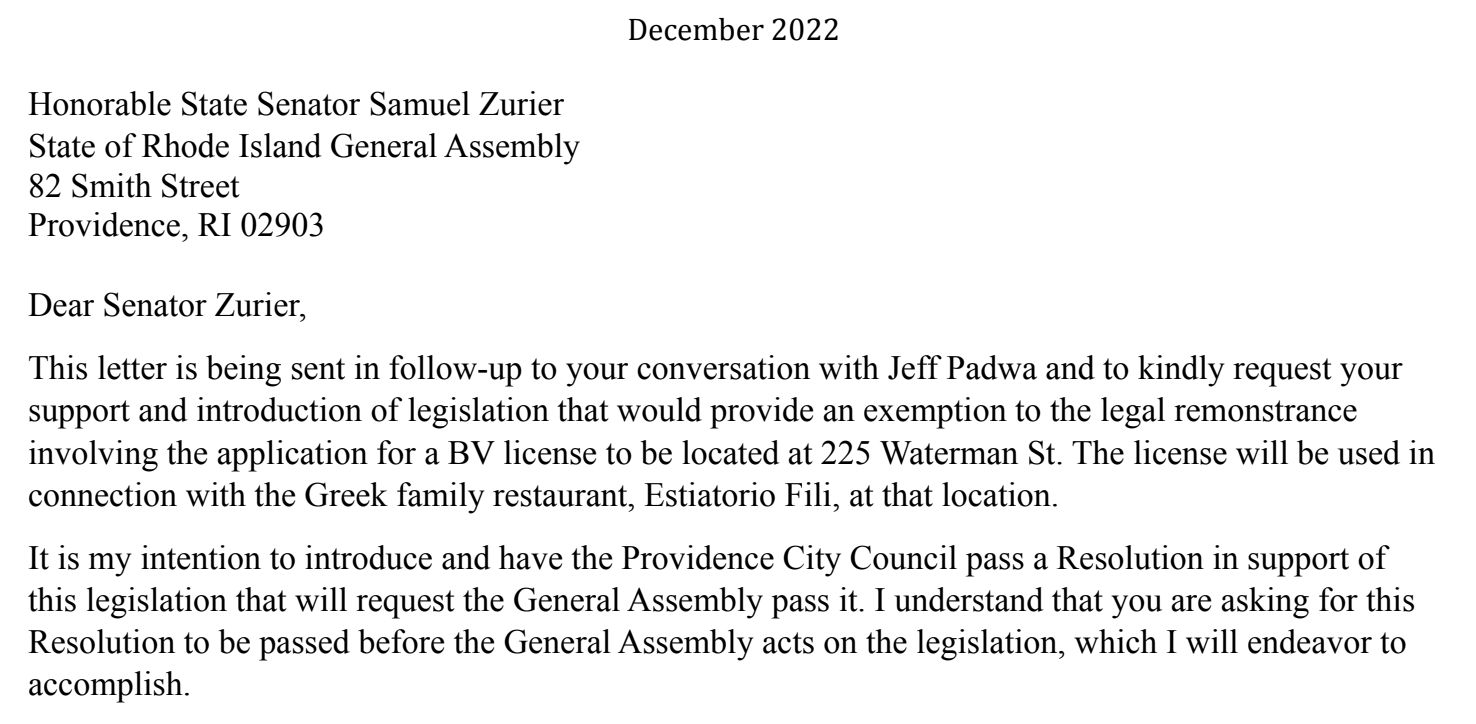 "This letter is being sent in follow-up to your conversation with Jeff Padwa and to kindly request your support and introduction of legislation that would provide an exemption to the legal remonstrance involving the application for a BV license to be located at 225 Waterman Street," wrote Goncalves.