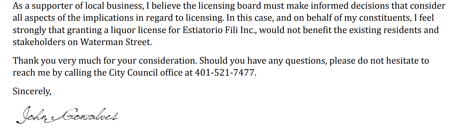 Goncalves, who represents Ward 1 (East Side and Fox Point), sent a letter on July 21, 2022, to the Providence Board of Licenses regarding the application by “Estiatorio Flli” at 225 Waterman Street for a full BV liquor license for a new Greek restaurant.